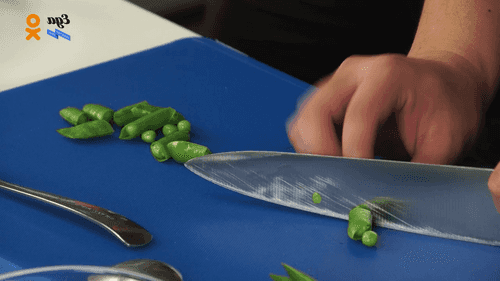 Горошек бросить в кипящую подсоленную воду прямо в стручках на минуту, затем охладить, чтобы остановить приготовление. Стручки разрезать пополам.