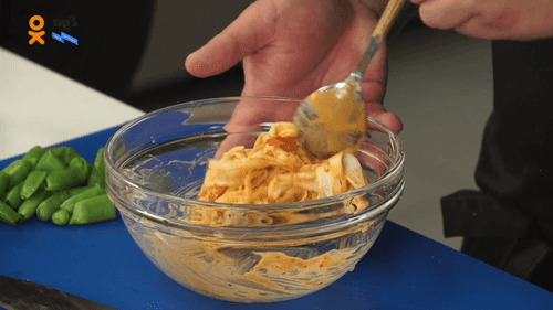 Смешать соус кимчи, сладкий чили и майонез. Крабовые палочки разорвать на волокна и смешать с соусом.