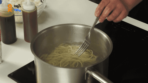 Лапшу отварить согласно инструкции на упаковке в подсоленной воде, затем слить воду, промыть лапшу и добавить немного растительного масла, чтобы лапша не слиплась.