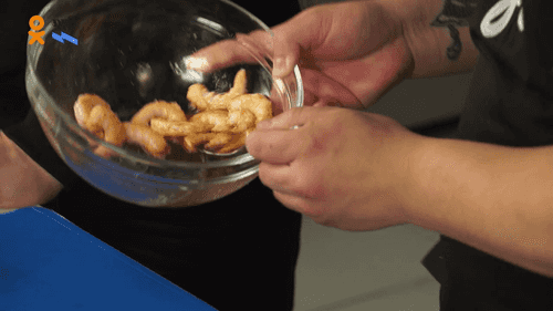 Вареные креветки очистить от панцирей и удалить кишку из спинки. Смешать их с понзу и соевым соусом.