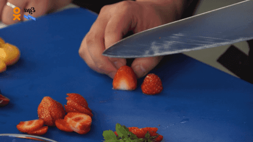 Абрикосы избавить от косточки, нарезать на 8 частей, черешни на четвертинки, клубнику на тонкие ломтики.
