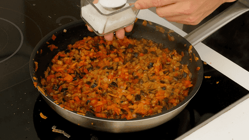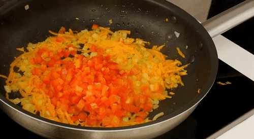 Параллельно в другой сковороде обжарить лук до мягкости, добавить морковь и сладкий перец, жарить, помешивая, в течение 10 минут, затем добавить помидоры и готовить еще 5 минут.