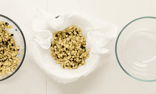 Баклажаны нарезать кубиками, посолить, перемешатьь. и оставить на полчаса. Затем отжать.
