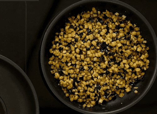 В сковороде разогреть половину масла, обжарить баклажаны в течение 10–15 минут, помешивая.