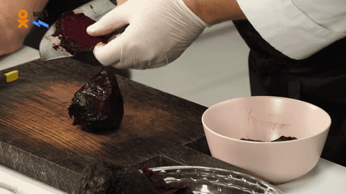 Свеклу запечь в фольге с солью в течение 50-60 минут в духовке, разогретой до 190 градусов. Затем охладить, очистить и нарезать тонкими ломтиками, такими же ломтиками нарезать очищенную фейхоа.