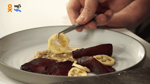 На тарелку выложить ореховый соус, поверх него — свеклу и фейхоа, очищенные и нарезанные тонкими ломтиками. К этому карпаччо подойдет акмелла, впрочем, тархун или кинза тоже будут хороши.