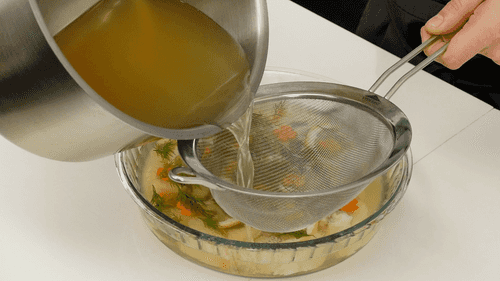 Бульон процедить и добавить к нему размоченный желатин, размешать до растворения желатина.