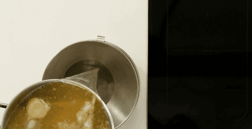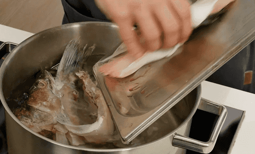 Кости, хвост и голову, избавленную от жабр, положить в кастрюлю и залить 2 литрами воды. Поставить на огонь, довести до кипения и снять пену.
