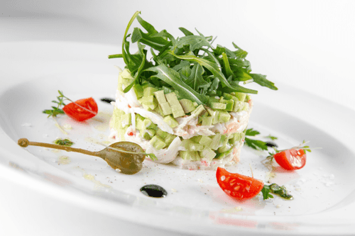 Тиан из авокадо и краба – изысканное блюдо итальянской кухни, которое сочетает в себе свежесть овощей и утонченность морепродуктов. Истоки его приготовления восходят к традиционным французским тианам, адаптированным к средиземноморскому стилю. Нежное авокадо и хрустящие огурцы гармонируют с сочным мясом краба, приправленным японским майонезом и соевым соусом. Лимонный сок добавляет легкую кислинку, а руккола придает пикантные нотки. Украшение из каперсов, черри, песто и бальзамического крема завершает образ, создавая сбалансированную гамму вкусов. Этот тиан не только радует глаз, но и идеально подходит для легкого обеда или романтического ужина, восхищая своей элегантностью и утонченностью.