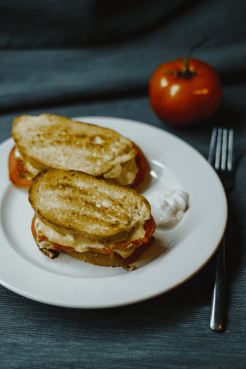 Рядом на сковороду или на отдельную сковородку выложить томаты и обжарить по 10 секунд с каждой стороны. После чего сразу положить помидоры на бутерброд сверху курицы и затем снова положить смесь сыра со сметаной. Сверху положить кусочек хлеба и прижать лопаткой. Но не сильно, иначе вся начинка вывалится. Сразу перевернуть на другую сторону и накрыть крышкой.