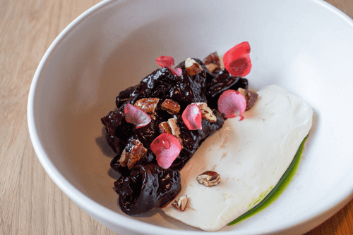 Выложить свеклу в соусе в тарелку, подавать с пресным сыром (например, страккино), творогом или йогуртом, и орехами пекан.