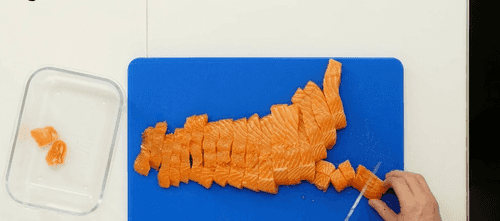 Свежую рыбу нарезать кубиками со стороной примерно 2 см, предварительно избавив ее от кожи и костей.
