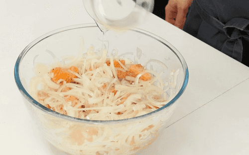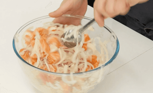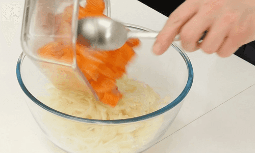 Смешать лук с рыбой.