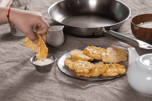 Оладьи из малоглазого макруруса — оригинальное блюдо русской кухни, вобравшее в себя нежность морской рыбы и домашний уют. Макрурус — глубоководная рыба с мягким, слегка сладковатым вкусом. Перед приготовлением филе освобождают от лишней влаги, что помогает сохранить его нежную текстуру. Смесь из муки, крахмала и яйца превращает рубленую рыбу в воздушное тесто, а жарка до золотистой корочки делает оладьи ароматными и аппетитными. Легкая хрусткость снаружи и сочность внутри — главные достоинства этого блюда. Подаются оладьи традиционно со сметаной, что дополняет их сливочной мягкостью. Идеальный вариант для семейного ужина или уютного домашнего завтрака, который приятно удивит тонким морским вкусом и хрустящей структурой.