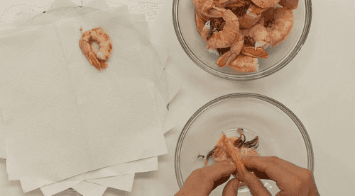 Остывшие креветки выложить на бумажные полотенца и очистить их от панцирей. Не нужно чистить креветки сырыми, так как при варке в панцире они лучше сохраняют форму и сок.