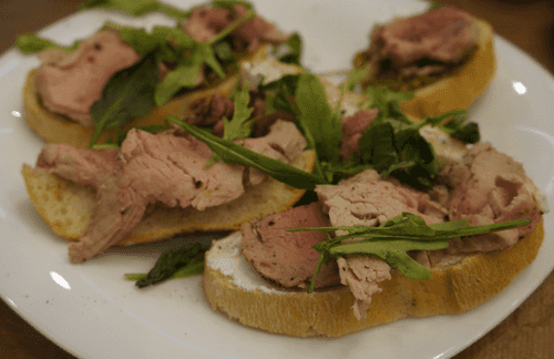 Пока мясо отдыхает, можно подготовить основу брускетт. Хлеб должен быть свежий и мягкий, его нужно намазать песто или сыром (кому что больше нравится).