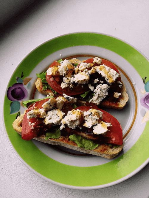 Сверху полить тонкой струйкой бальзамическим соусом. Если использовать уксус, то просто сбрызнуть тосты.