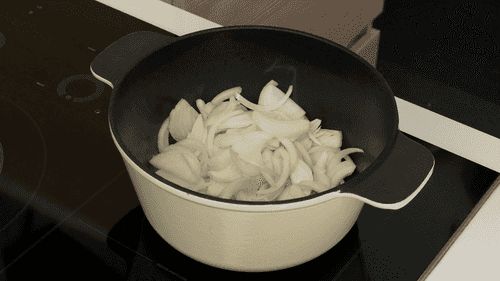 Отправить бекон на разогревающуюся сковороду. Вытопить жир из бекона, постепенно увеличивая огонь, на это уйдет около 5 минут. Добавить лук и обжаривать на среднем огне, помешивая, пока лук не станет прозрачным.