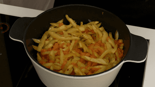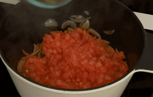 Добавить паприку, перемешать и сразу же добавить измельченные помидоры.