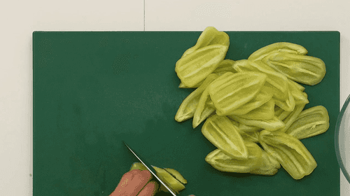 Нарезать перцы тонкой соломкой.