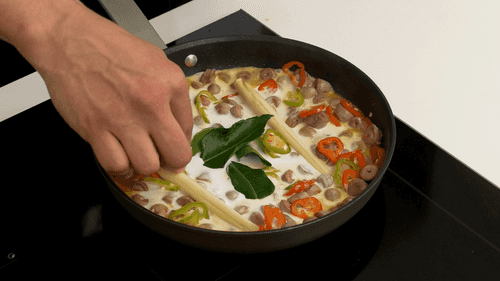 Обжарить куриные сердечки на подсолнечном масле, добавить чили, листья лайма, лемонграсс, коричневый сахар, кокосовые сливки, рыбный соус, сок лайма и немного цедры лайма, все затянуть.