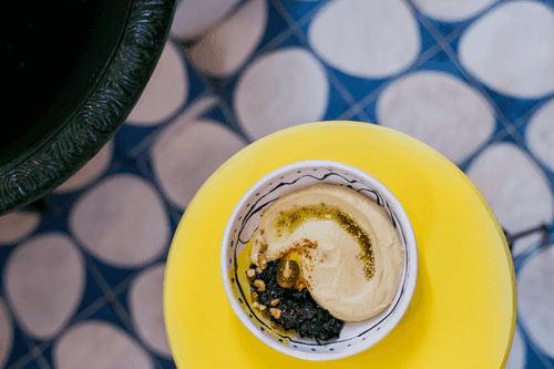 Выложить хумус на тарелку, полить оливковым маслом, смешанным с заатаром.