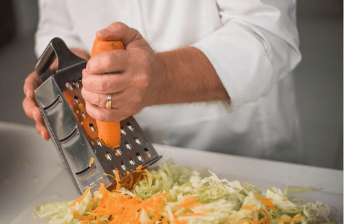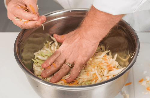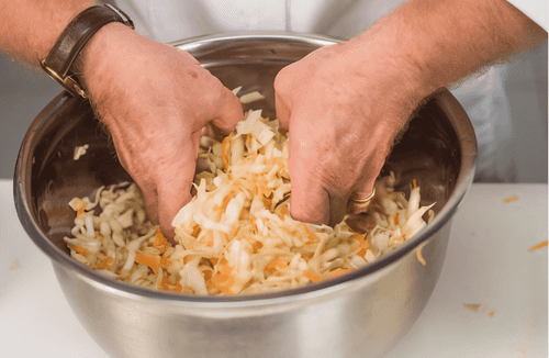 Перемешать капусту на доске или в лотке. Не надо буквально стирать капусту — достаточно немного помять руками, чтобы дала сок, перемешать с морковью и сразу переложить в емкость для засолки. Если слишком сильно размять капусту, сок выделится интенсивно и капуста получится сухая.