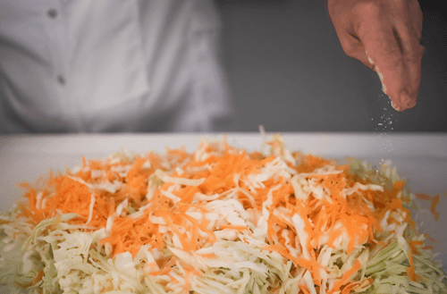 Рассыпать соль по всей поверхности. Добавить сначала грамм 40–50, перемешать, попробовать — если капуста в меру соленая, добавить еще соли. Капуста должна на вкус быть немножко пересоленной.