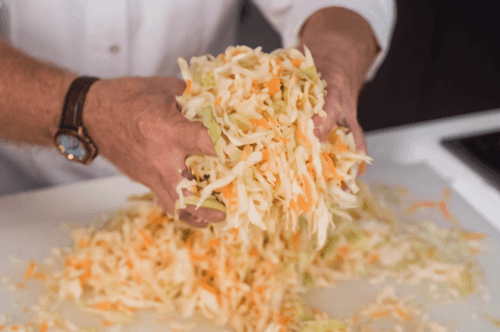 На третий день капуста должна пустить пену — это значит, что можно отправить ее в холодильник. Через два дня капусту можно есть, а еще через два дня она полностью готова. Итого неспешный процесс квашения занимает дней пять — неделю. Можно заправлять маслом, добавлять клюкву и есть.