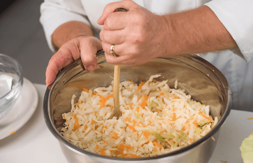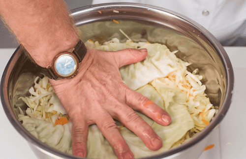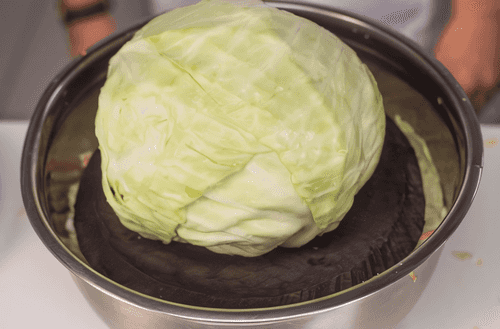 Через час-два снова открыть капусту, запустить в емкость руки и поворошить, чтобы газы все вышли. И так нужно делать три дня подряд. Все это время капуста квасится при комнатной температуре.