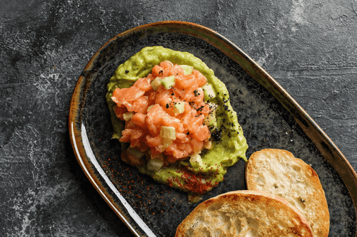 Лососевый тартар — изысканное блюдо французской кухни, воплощающее элегантность и свежесть. Его корни уходят в традицию сырых закусок, где свежие морепродукты раскрывают свой чистый вкус. Нежный лосось, нарезанный кубиками, дополняется освежающими огурцом и луком-шалот, пропитываясь ароматом соевого соуса и лимонного сока. Вкус раскрывается на фоне кремового гуакамоле с легкой пикантностью чили. Хрустящие кусочки чиабатты добавляют текстурный контраст, а украшение из высушенных маслин завершает композицию. Это блюдо идеально для легкого ужина или элегантной закуски, в которой сочетаются свежесть, яркие вкусы и утонченность французской гастрономии.