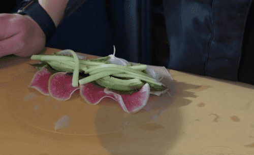 Спаржу очистить у основания от верхней грубой кожуры при помощи экономки, бланшировать 1 минуту в кипящей воде, затем бросить в ледяную воду, чтобы остановить приготовление. Нарезать спаржу, огурец, дайкон и авокадо соломкой. Красную редьку нарезать тонкими кольцами.