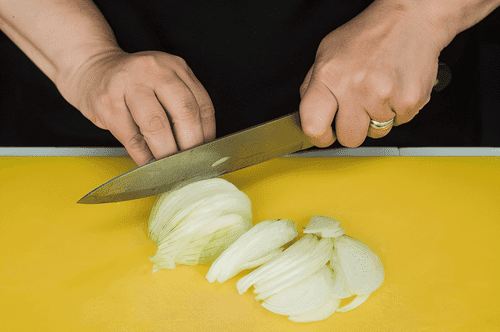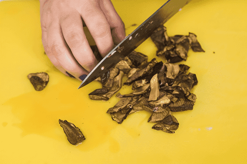 В первую очередь замочить сухие белые грибы. Налить в них столько воды, чтобы она примерно на толщину пальца превышала их объем в миске. Пока грибы вымачиваются, нарезать полукольцами 2 большие луковицы.