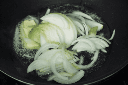 Налить в сковороду растительное масло и добавить 50 грамм сливочного. Как только масло зашкворчит, бросить лук. Обжарить лук на среднем огне, периодически помешивая.