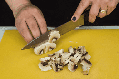 Пока лук жарится, подготовить шампиньоны. С шляпок руками или небольшой щеткой снять черные точки (это пятнышки грязи), но ни в коем случае не мыть грибы. В шампиньонах и так много воды, лишняя влага не нужна. Нарезать грибы произвольно.