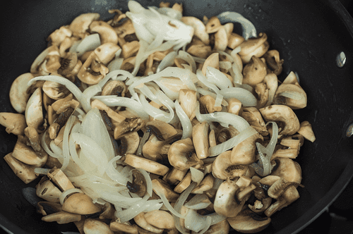 Когда лук станет прозрачным, добавить в сковороду шампиньоны, перемешать. Практически сразу же начнет выделяться влага.