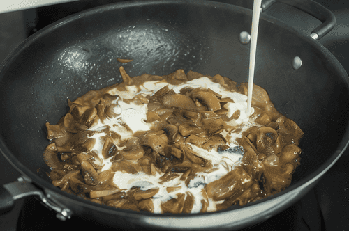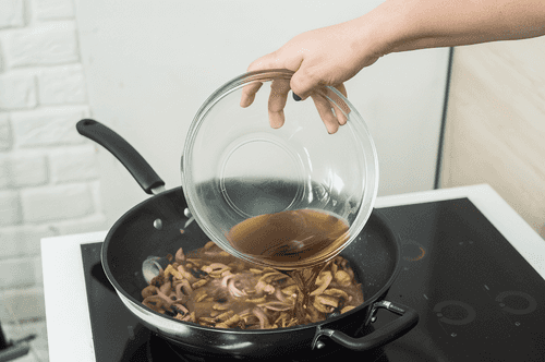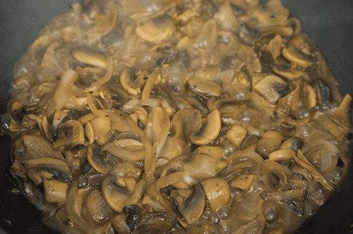 Добавить эту жидкость в сковородку к луку и грибам. Это нужно, чтобы усилить вкус белых грибов.
