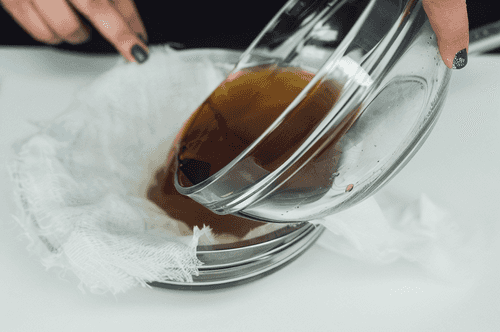 Взять миску, положить в нее сито, на сито — марлю; процедить воду, в которой вымачивались белые грибы.