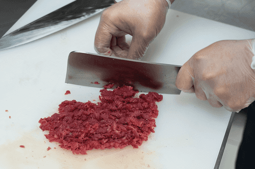 Нарубить говядину. Рубить надо вручную, так фарш получится более сочным, чем если пропускать мясо через мясорубку. Сначала мелко нарезать говядину, а потом еще мельче порубить ножом для мяса в виде топорика и отбить им мясо в течение 2 минут, чтобы оно стало более мягким. Готовый фарш должен держаться единой массой, но при этом разделяться на мелкие кусочки, если потереть его между пальцами.