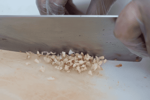 Затем мелко нарубить вешенки или другие азиатские грибы, например, шиитаке.