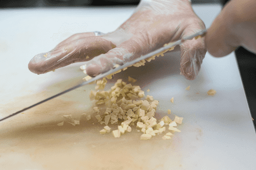 Мелко нарезать зубчик чеснока и лук-порей.