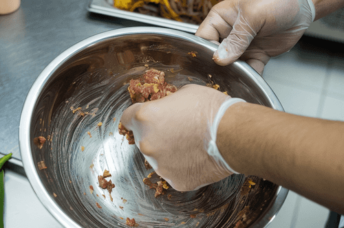 Хорошенько замесить фарш руками, а когда визуально он станет однородным, несколько раз взять его в руки и с силой ударить об столешницу или доску, чтобы все ингредиенты окончательно сцепились между собой. Отставить его, накрыв фольгой.