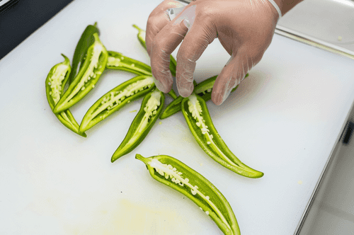 Разрезать острые перцы вдоль пополам. Чайной ложкой вычистить семена. В них основная острота.