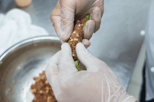 Добавить к фаршу мелконарезанный тофу. Его можно нарубить несколько крупнее, чем мясо и порей, чтобы в фарше оставалась текстура.