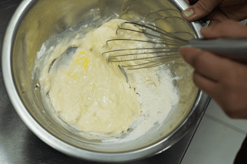 Смешать все в миске, добавить яйцо, 20 грамм муки, сухой бульон даши, 2 грамма соли, 1 грамм молотого черного перца, кунжутное масло и кисло-сладкий соус.