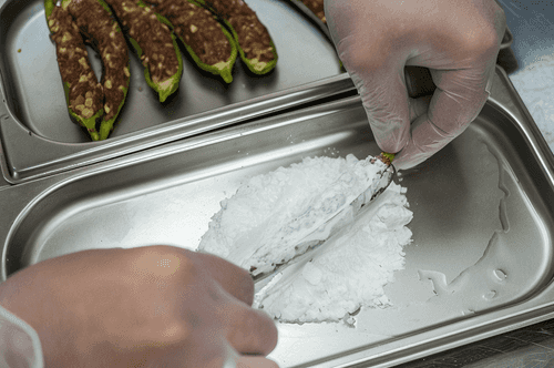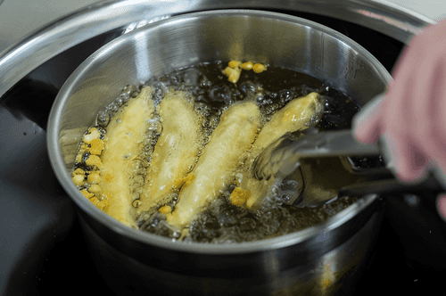 Окунуть каждый перец в кляр, держа его за хвостик, и бросить в масло. Когда кляр начнет менять цвет на золотистый, процесс почти завершен. Постоянно переворачивать перцы щипцами, чтобы они равномерно прожарились со всех сторон. Всего процесс занимает около 4–5 минут.