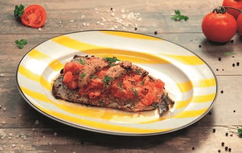 Выложить на блюдо сельдь, а сверху — помидоры и немного икры и молоки. Украсить укропом.