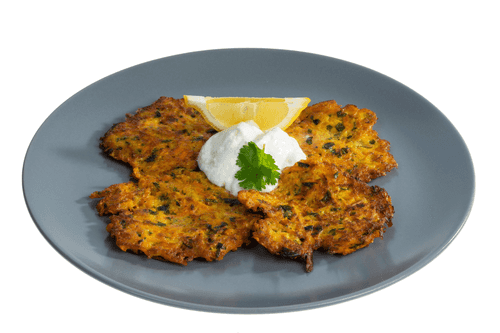 Обжарить оладьи в разогретом масле до румяного цвета с обеих сторон. Подавать с йогуртом и долькой лимона.