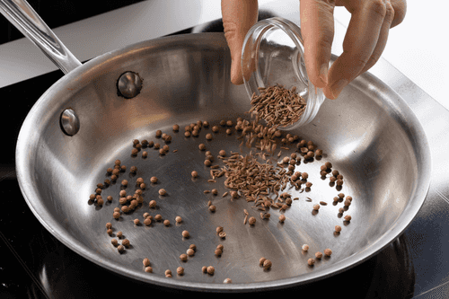 Обжарить зиру с кориандром, чтобы дали аромат, и измельчить их в блендере или в ступке.