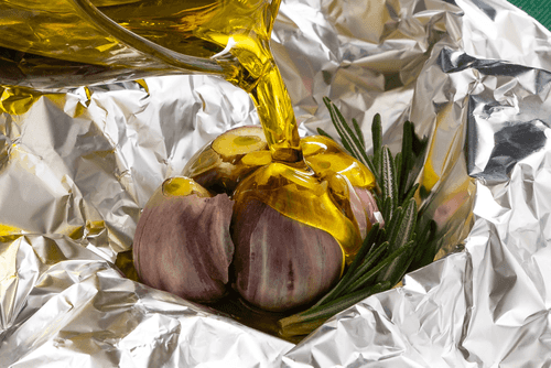 У головки чеснока срезать нижнюю часть так, чтобы обнажились зубчики. Выложить головку на кусок фольги, сбрызнуть оливковым маслом, положить веточку розмарина, посолить, поперчить. Завернуть в фольгу и отправить в разогретую до 220 градусов духовку на 35–40 минут.